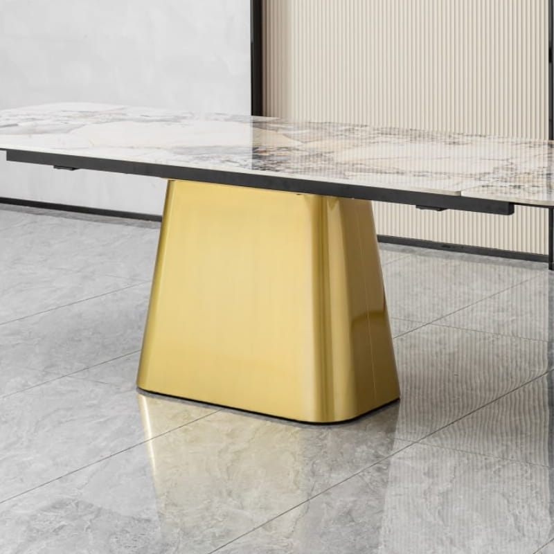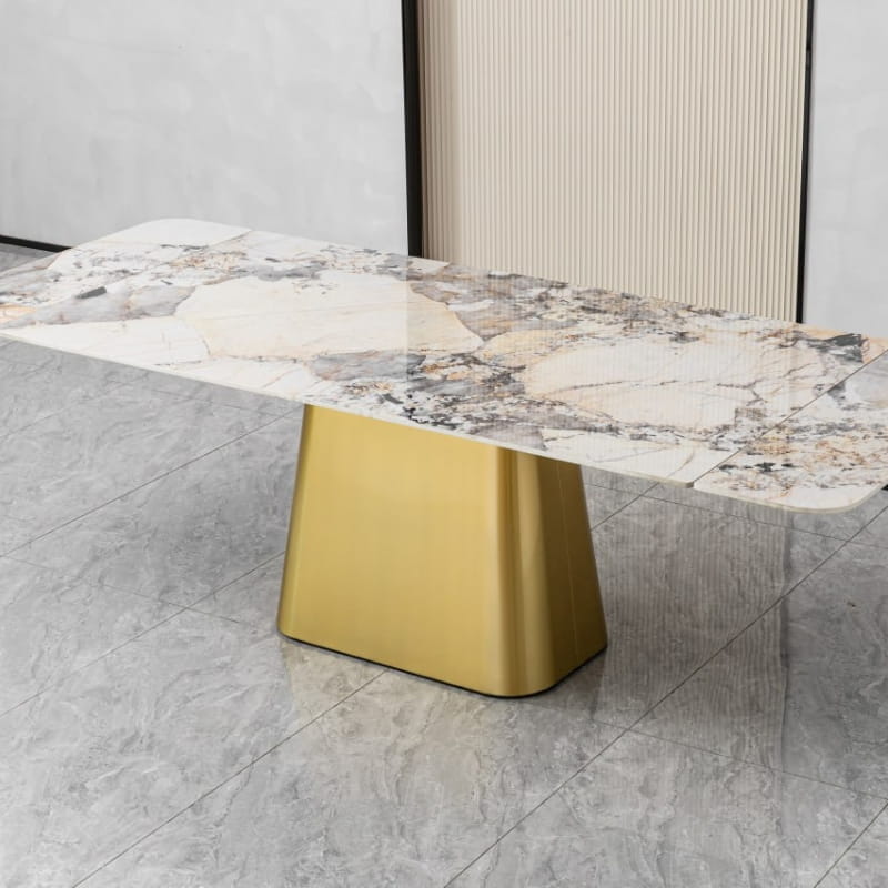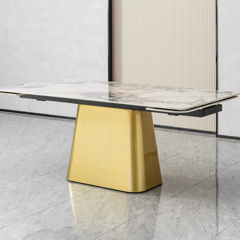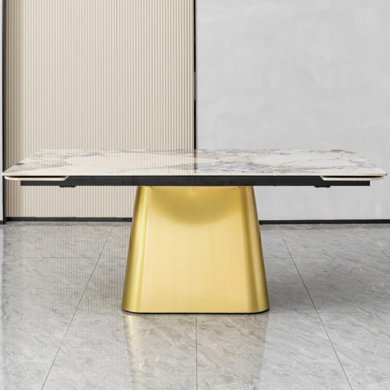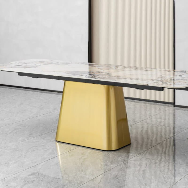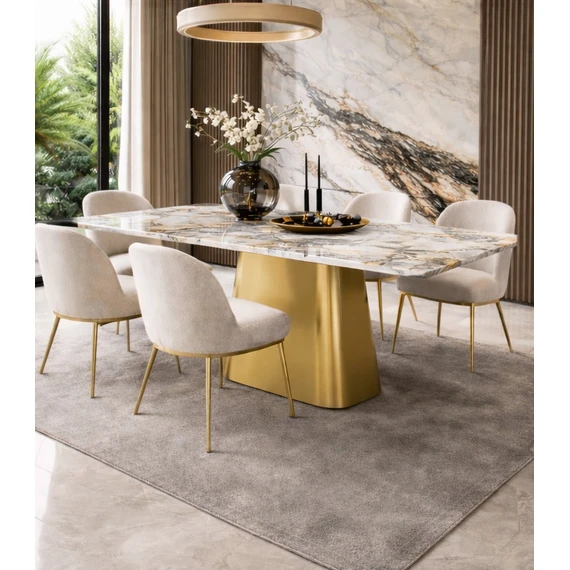Solidny stelaż ze stali nierdzewnej w wykończeniu szczotkowanego złota nadaje lekkości i prestiżu, tworząc elegancką i spójną kompozycję. BELISSIMA to stół premium, który doskonale sprawdzi się w nowoczesnych jadalniach, eleganckich salonach oraz prestiżowych przestrzeniach komercyjnych, podkreślając charakter wnętrza i jego designerski styl.